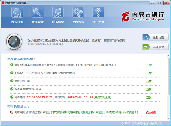 内蒙古银行网银助手官方版能够对用户的操作系统、网络连接状态、网银安全组件、IE浏览器安全设置以及网银UKey等关键信息进行全面检测。