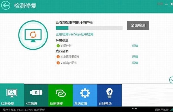 一键修复后,网银助手将为您完成登录网银的所有准备工作。您可通过【快速链接】选择所需的网上银行服务。