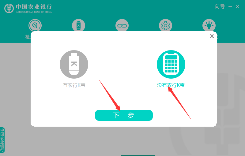 1、打开软件,根据是否持有农行K宝进行选择,随后点击下一步。