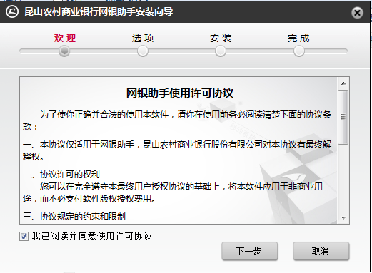 2、我们双击该exe文件,仔细阅读网银助手使用许可协议。