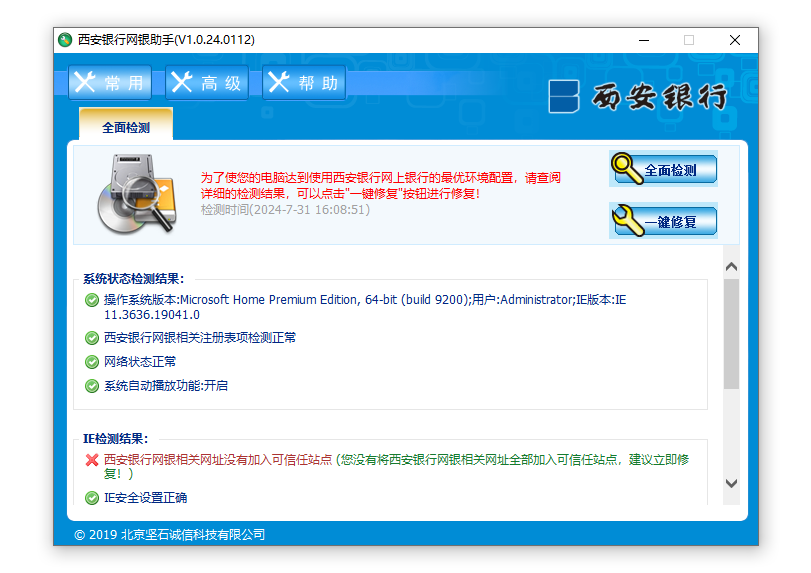 4、西安银行网银助手支持一键修复配置问题,简化网银环境搭建流程。
