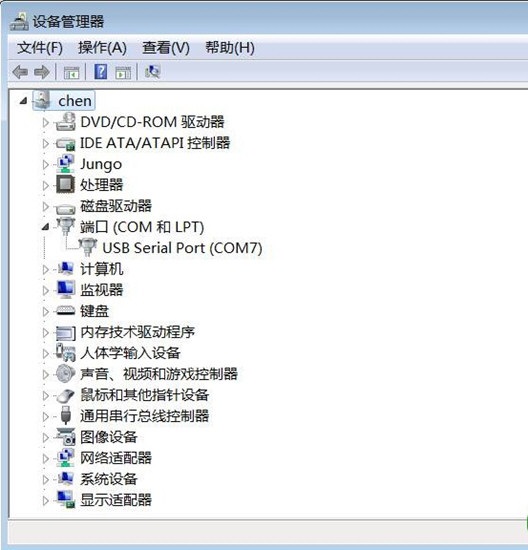 2、最后看到设备管理器中出现COM7端口号表示已成功完成安装。根据硬件添加向导一步步的引导安装驱动