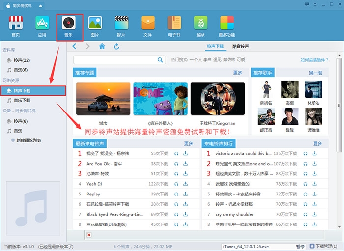 1、同步助手铃声站拥有丰富的铃声资源,进入【音乐-网络资源-铃声下载】可以任意挑选自己喜爱的铃声试听并下载。
