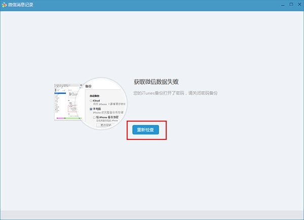 3、在该软件中的【获取微信数据失败】提示中点击【重新检查】即可。