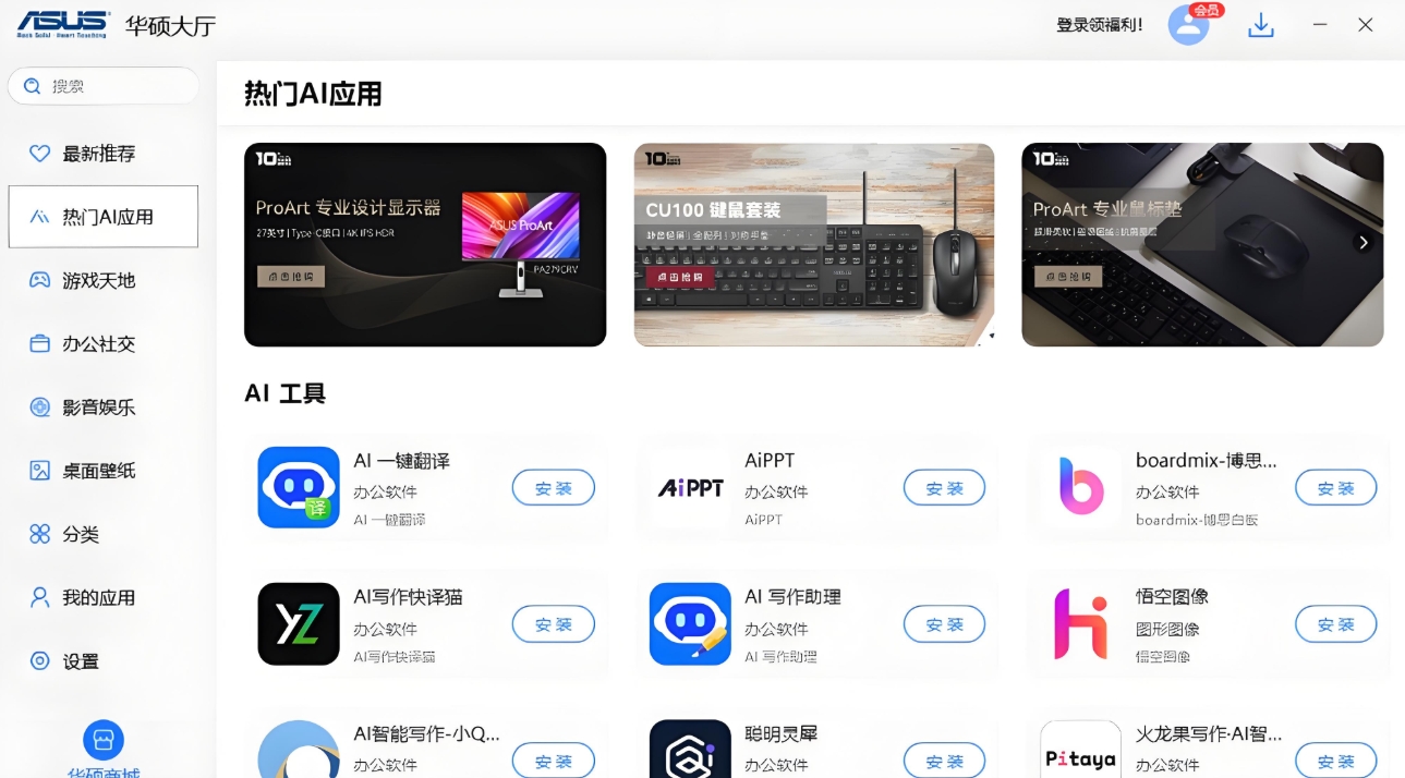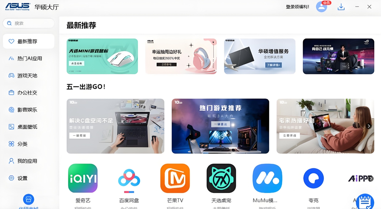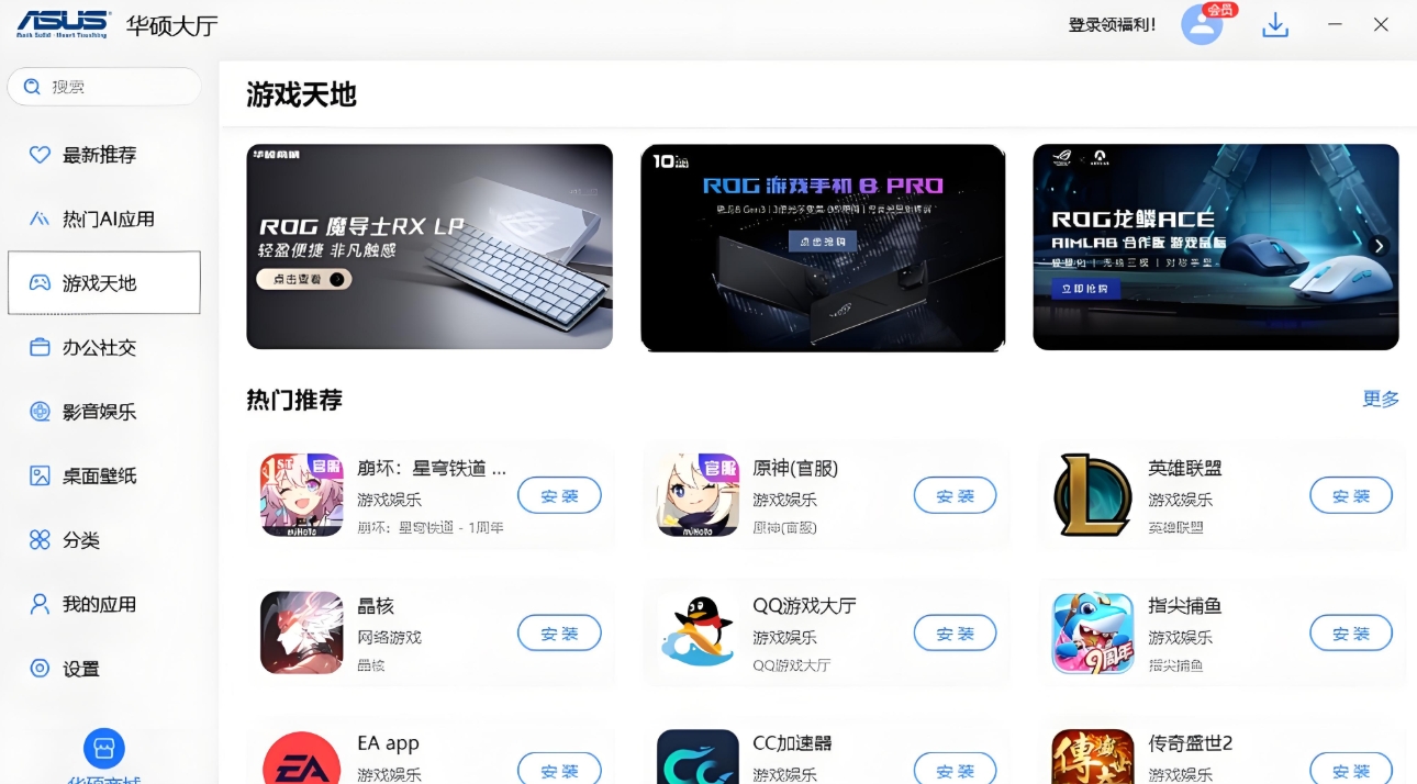 华硕大厅官方版是由华硕官方推出的一款电脑应用管理软件。华硕大厅致力于为用户提供安全可靠的热门应用软件与游戏资源下载、更新管理及专属会员服务。华硕大厅具备资源丰富、同步便捷、一键更新及个性化设置等特色功能,不仅为用户带来高效、便捷的应用管理体验,还让用户享受到更多购物乐趣。