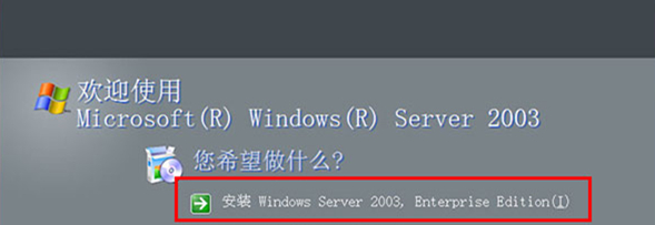 ②安装成功后,加载Windows Server 2003企业版安装程序,加载成功后,出现安装界面,选择“安装windows server 2003 enterprise edition”开始安装,按照安装提示进行操作即可。