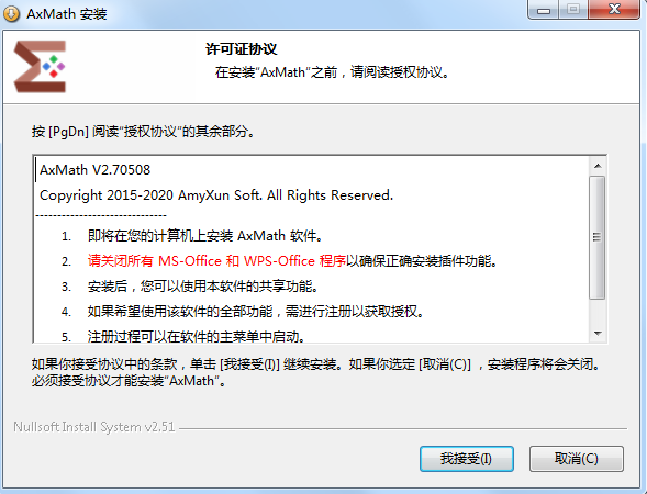 1.在本站下载AxMath(公式编辑器)官方版安装包,双击exe程序,进入安装向导,阅读许可协议,单击我接受