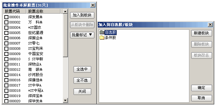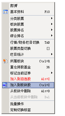 按前面介绍的方法找到需要的股票后,用鼠标右键点击它,从弹出菜单上选择〖加入到自选股〗或〖加入到板块〗,或按Ctrl+Z。删除自选股按ALT+D