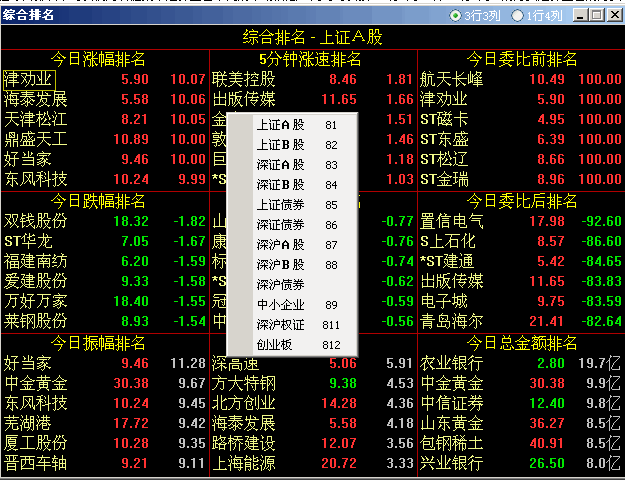 敲数字81、82、83、84、85、86、87,可分别调出上海A、B股,深圳A、B股,沪债、深债,深沪A股的综合排名。系统用9个排成方阵的小窗列出所选市场的股票的涨幅、跌幅、振幅、5分钟涨幅、5分钟跌幅、量比、委比、成交金额排名。