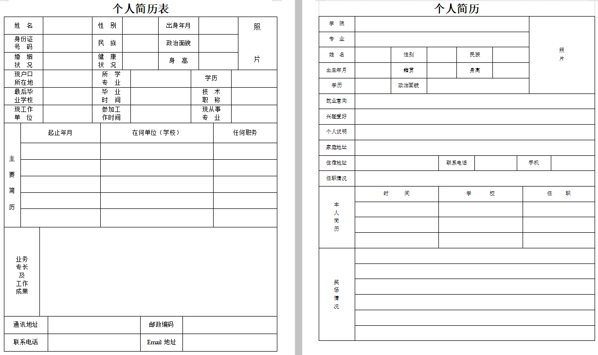 现成的空白个人简历表格,word格式,有标准简历模板,也有适合应届生用的。简历也没啥与众不同些,能以最少的文字描述你要表达的能力就OK了。现在的HR这么快,哪有那个闲情去的欣赏你的简历,也没时间去看那么多的文字。