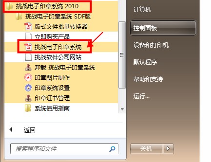 操作方法一:点击电脑桌面左下角的【开始】按钮,在所有程序和文件中点开【挑战电子印章系统 2010】文件夹,并单击运行【挑战电子印章系统】即可。