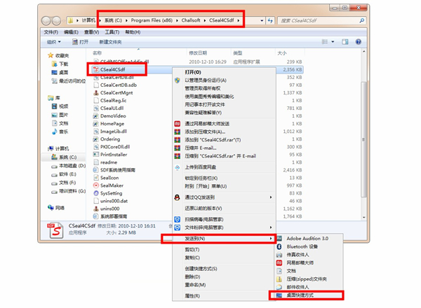 操作方式二:打开软件安装目录,一般默认地址为“C:Program Files (x86)ChallsoftCSeal4CSdf”选中文件夹中的【CSeal4CSdf.exe】,并单击鼠标右键选择发送到【桌面快捷方式】。