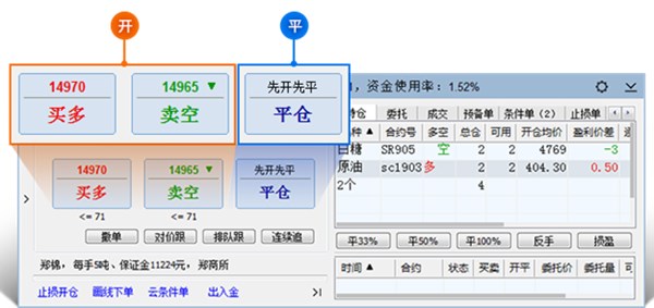 三键下单简化下单操作步骤,将开、平独立分区,开仓时只需选择买多卖空,平仓出场时点击平仓即可(电脑帮你判断买平还是卖平),比传统下单板更清晰、明确、节省判断思考时间。