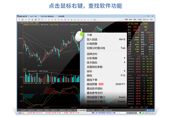 赢顺云交易软件在设计中,为每个界面所能做的操作都精心准备了右键菜单,所以如果在使用软件过程中找不到某个功能,可直接点击鼠标右键查看。