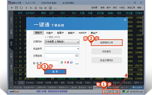 双击桌面快捷方式可直接看行情;如果交易需点击“期货户/外盘户”按钮(如图所示),在弹出的窗口中选择开户公司,输入资金账号及密码,即可登录交易。
