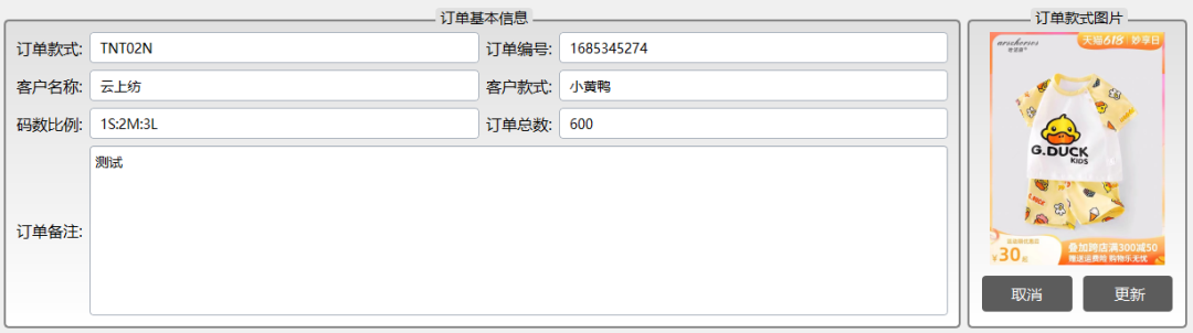 首先按照提示填入订单的基本信息,包括订单款式,客户真实款式,码数比例,订单总数,以及订单备注。其中,码数比例和订单总数则是展示给裁床人员查看,所以务必填写清楚。