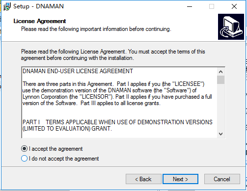 2、进入DNAMAN安装协议界面,点击【I accept the agreement】,然后点击【next】。