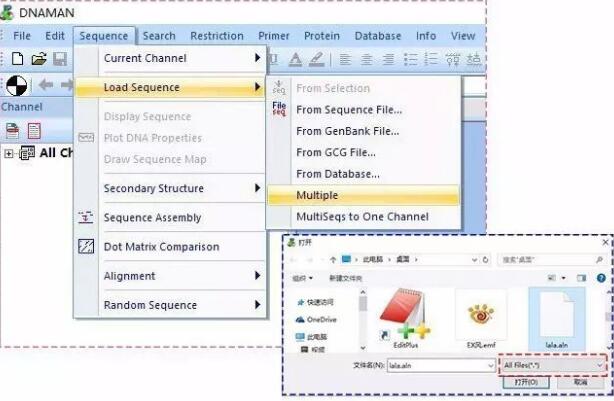 1、打开DNAMAN软件,打开软件后,点击菜单栏的Sequence选项,在弹出的选项中选择Load Sequence,在弹出的二级菜单中点击Multiple,选择您要添加对比的文件。