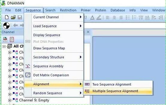 2、导入序列后,点击Sequence,在弹出的选项中选择Alignment,再选择Multiple Sequence Alignment,参数全部保持默认,点“下一步”就可以。