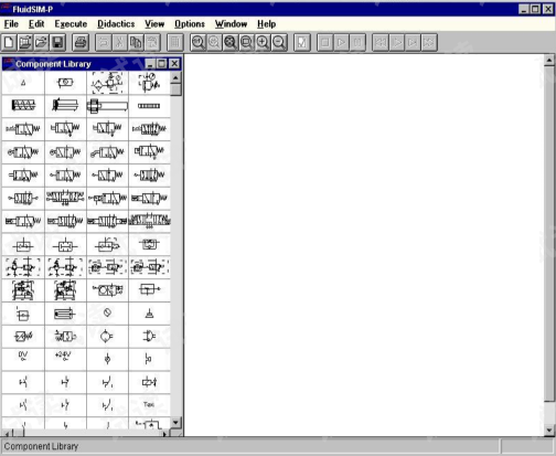 左边是FluidSIM的元件库:它包含为创建新的回路图所必需的气动和电气元件。窗口顶端的菜单栏列出了需模拟和建立回路的所有功能。菜单下面的工具栏展示了经常使用的菜单功能。