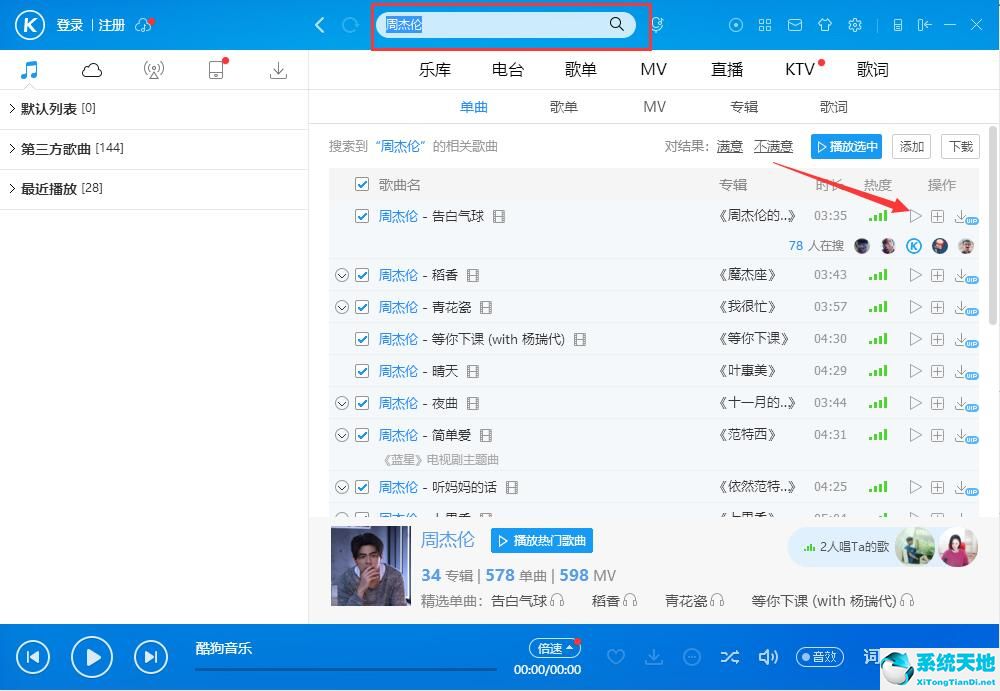 2、如果在首页列表中没有看到想要听的歌曲的话,可以从酷狗音乐顶部的搜索栏中搜索歌曲相关的名称或歌手,然后点击搜索框后方的放大镜按钮进行搜索。之后在搜索结果的列表中找到想听的歌曲,点击该歌曲后方的“?”播放按钮即可开始播放。