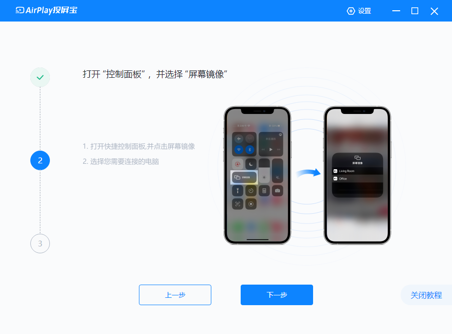 打开IOS设备的快捷控制面板,点击“屏幕镜像”,选择需要链接的电脑;