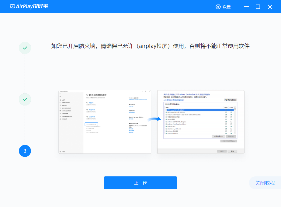 如您已开启电脑防火墙,请确保已允许(AirPlay投屏宝)使用,否则将不能正常使用软件;