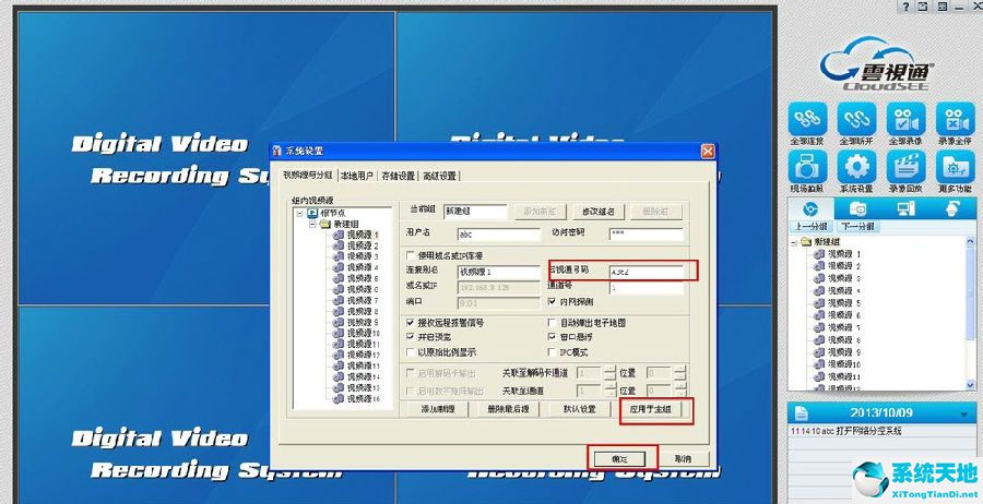 3、进入云视通网络监控系统主界面,在【系统设置】-【视频与分组】-【云视通号】(输入主控端的云视通号码)-【应用于全组】-【确定】,如下图所示: