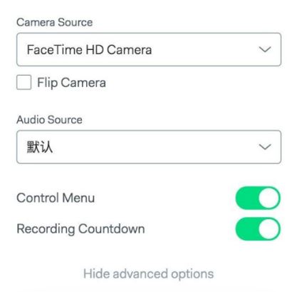 Loom默认显示了比较常用的选项,当然我们可以选择打开高级选项(Show advanced options ),在展开的高级选项中,我们可以选择摄像头和声音的采集源,这里你就可以根据自己的需求选择了。同时还有摄像头菜单显示和录屏倒计时的显示与隐藏,最下面就是开始录制(Start Recording)的选项了。
