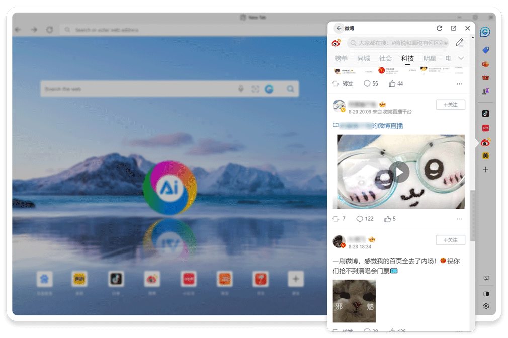 侧边栏集成高效办公工具,支持个性化配置抖音、小红书、微博等平台,随时获取最新资讯。工作娱乐需求,一站即可满足!