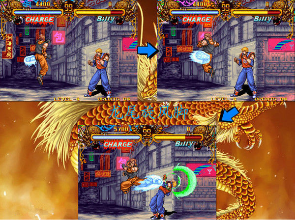 连续技:在双截龙格斗游戏中主要有两类的连续技,一类是以必杀技来取消普通技收招而形成的必杀技取消,而另一类则是和少年街霸的类似连锁技,按顺序由轻到重的按攻击键,便可以连续攻击对手,但要在OVERDRIVE MODE中才可用。
