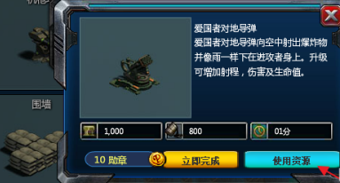 我们就来到爱国者对地导弹的建造界面。点击爱国者对地导弹下方的使用资源。这里,我们需要花费金属1000、石油800。