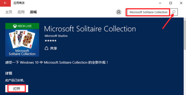 在应用商店的搜索框中输入Microsoft Solitaire Collection进行搜索,在搜索结果中点击安装,然后按提示操作就可以了。
