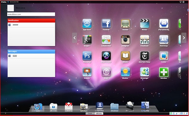 iPadian是一款基于Adobe Air框架开发的iOS界面模拟器,需要依赖Air平台才能正常运行。启动后软件会以智能半屏模式显示,完美保留Windows 7系统的任务栏可见区域,让用户在Windows操作系统下也能沉浸式体验iOS界面。该模拟器精心还原了iOS系统的视觉元素,不仅配备了风格统一的图标设计和质感细腻的背景画面,还在屏幕底部设置了标志性的苹果Dock栏,营造出逼真的苹果系统使用环境。