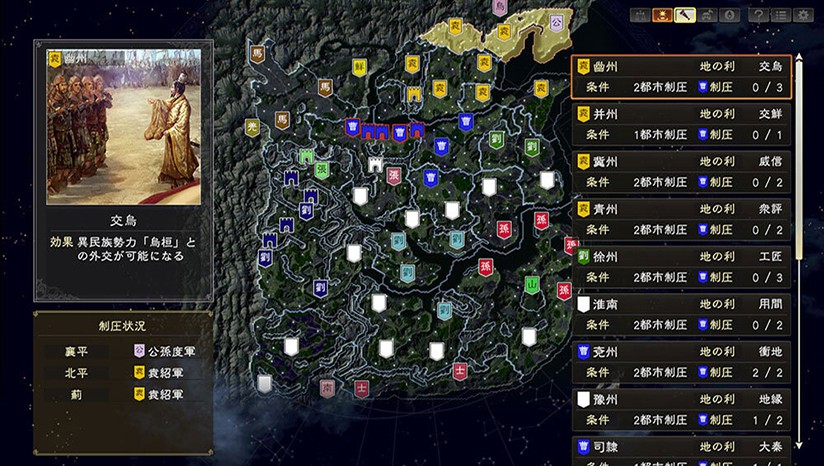 游戏将以“州”为单位设置“地利”系统,其效果包括“扩大自动占领范围”“可与乌桓势力开展外交”等。攻占不同州后,玩家可采取多样战略。根据自身战术布局,巧妙运用己方“地利”并瓦解敌人的“地利”优势,将成为取胜关键。
