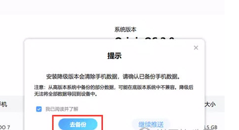 4、降级会清除手机所有数据,请按照指引点击去备份,此时会提示安装互传软件,可通过互传软件备份手机数据。如果已经提前通过互传备份了手机数据,请点击继续推送。