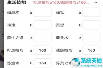 3、最后,在设置筛选条件的时候选择“生活技能”的选项,将炼金术、打造技巧和炼金技巧设置为160即可搜索满足条件的打造号了。