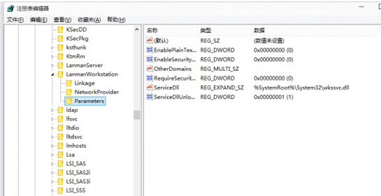 2、定位到HKLMSYSTEMCurrentControlSetServicesLanmanWorkstationParameters;