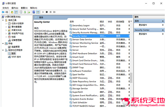 1、首先进入win10桌面,右键点击此电脑--管理--服务和应用--服务--找到 Security Center此项;