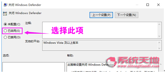 4、双击打开右侧中的“关闭 windows Defender ”,设置为“已启用”状态,并点击确定即可。