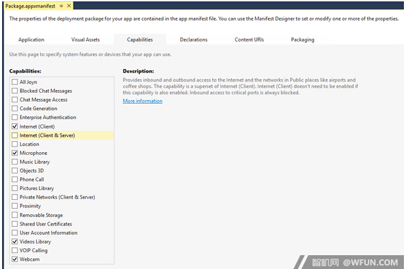2、启用package.appxmanifest功能,确保麦克风和视频库(用于保存音频文件)以及网络摄像头功能被选中: