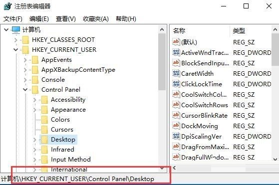 2、依次打开定位到:HKEY_CURRENT_USERControl PanelDesktop,如下图所示。