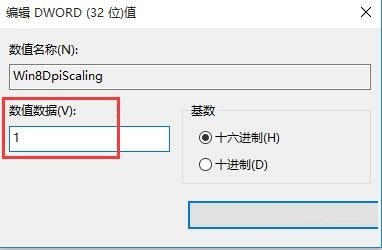 3、在右侧找到并打开Win8DpiScaling,将数据数值改为1,如下图所示。