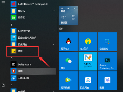 1、首先打开电脑桌面菜单,找到并点击【便笺】,如下图所示。