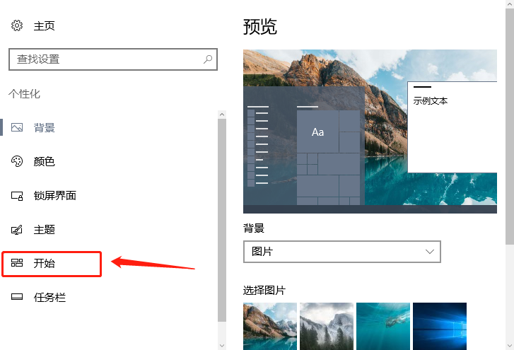 2、然后在个性化界面中选择左侧的【开始】选项卡,如下图所示。