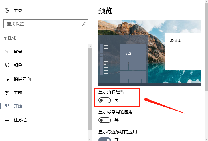 3、接着找到右侧界面的【显示更多磁贴】,将下方的开关打开就可以扩大磁贴页面,关闭磁贴页面就会减小,根据需求设置即可,如下图所示。