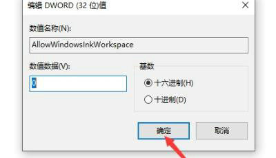 5、最后修改:AllowWindowsInkWorkspace,在打开的编辑窗口中修改数值数据为0,完成后重启,如下图所示。