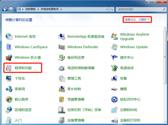 2、然后选择“大图标”的查看方法,找到并点击打开“程序和功能”,如下图所示。
