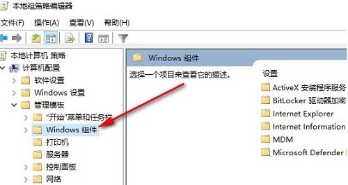 3. 打开管理模板选项之后,在下拉列表中再点击打开“Windows组件”选项,如下图所示。