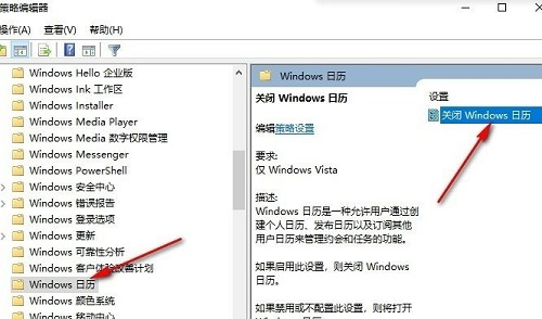 4. 在“Windows组件”中,找到“Windows日历”选项,双击打开页面右侧的“关闭Windows日历”选项,如下图所示。